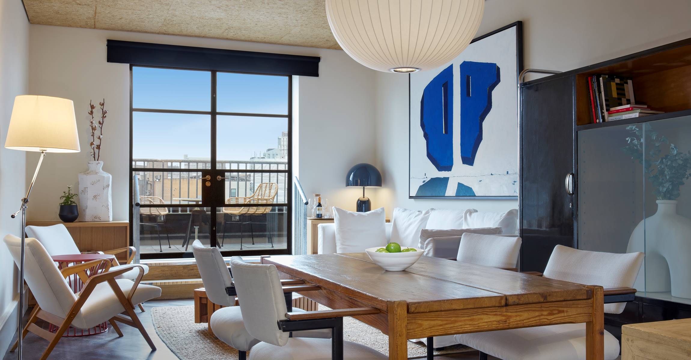 Studio Suite North is our largest suite with comfy sitting and dining room, relaxing bedroom, and a large wrap-around private terrace with views of Shoreditch and space to dine and relax. Furnished with a mix of bespoke and curated vintage furniture, it’s like having your own East London Apartment.