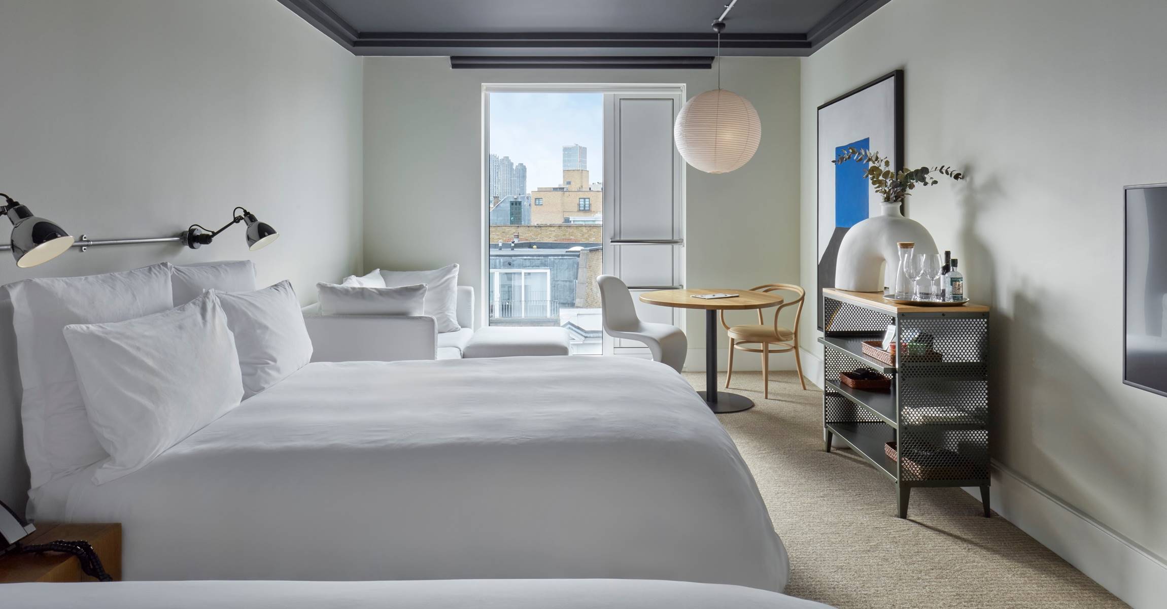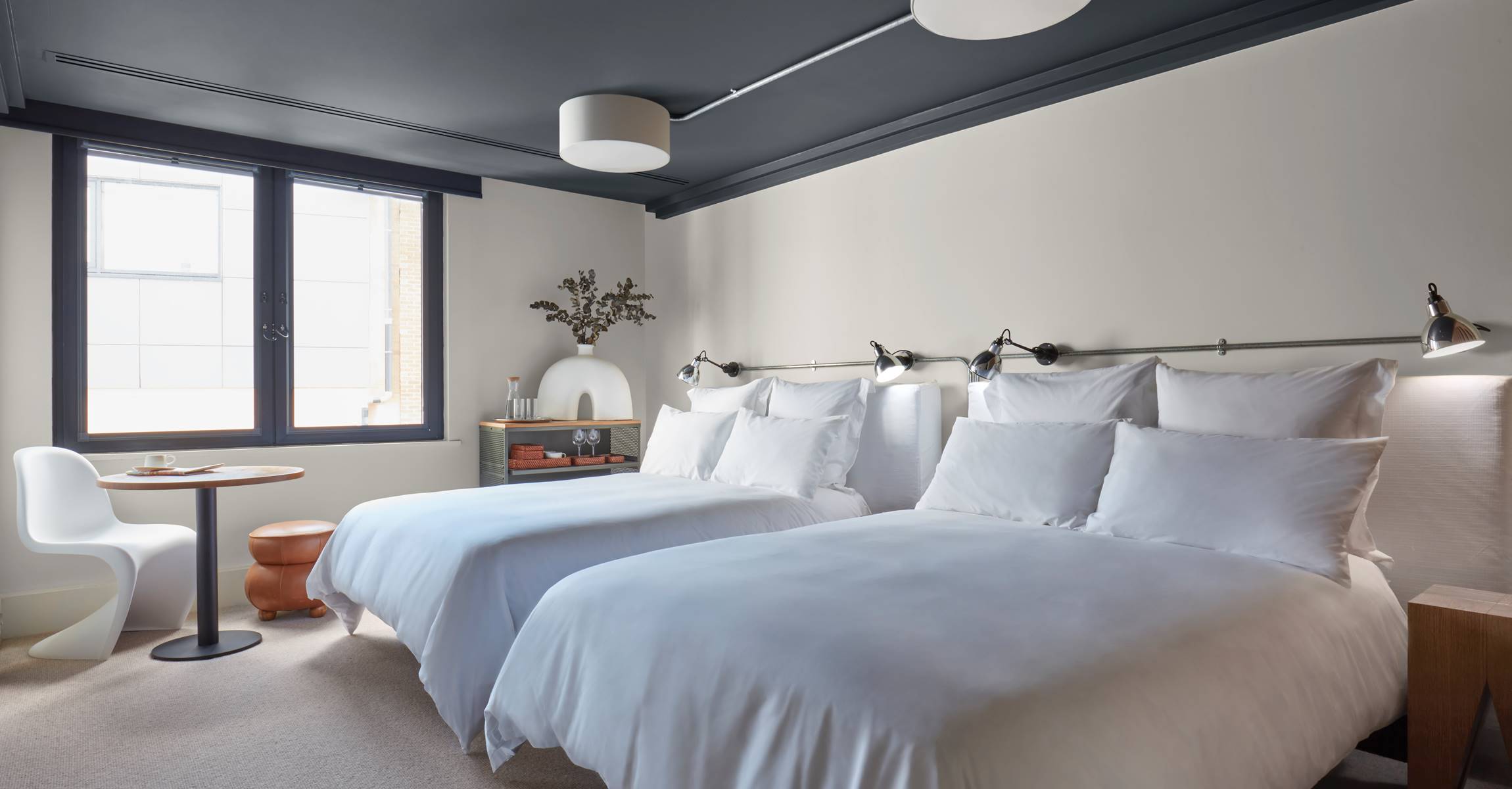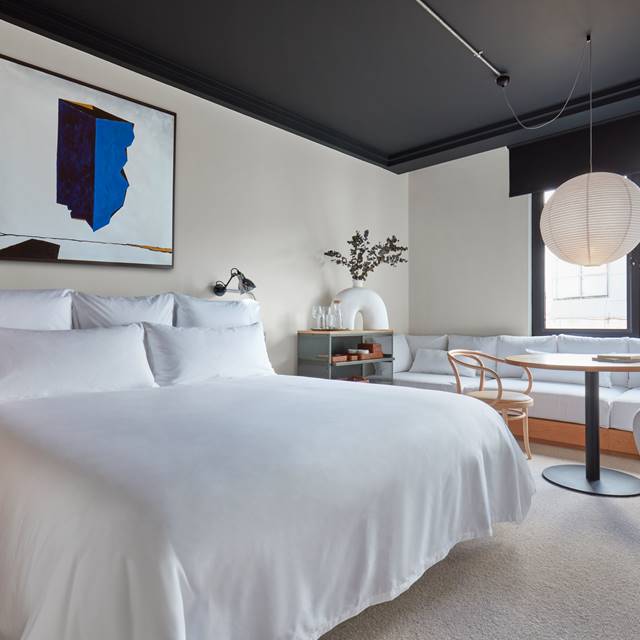 Our Studio Double Double rooms have two super comfy double beds, hybrid work and dining spaces with seating, bespoke art work by Jacu Strauss and a feature tapestry wall. Ideal for overnights and long weekends.